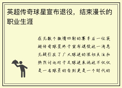 在无数个激情四射的赛季后,一位英超传奇球星终于宣布退役,这一消息无疑引发了广大球迷的深切关注和热烈讨论。对于足球迷来说,这不仅仅是一名球员的告别,更是一个时代的终结。这个传奇球星的职业生涯充满了光辉与成就,他的离去标志着英超历史上的一页传奇篇章的结束。